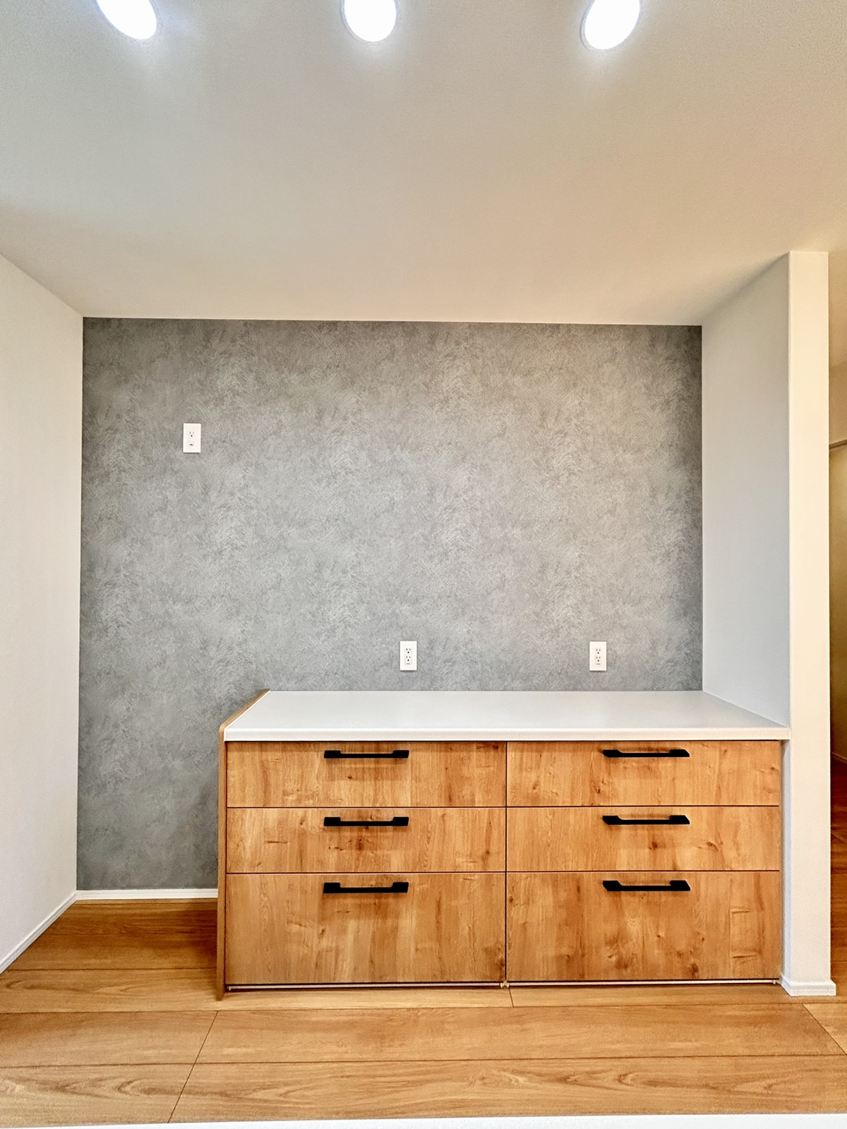 【キッチン背面に採用したアクセントクロスは、人気のグレー色】