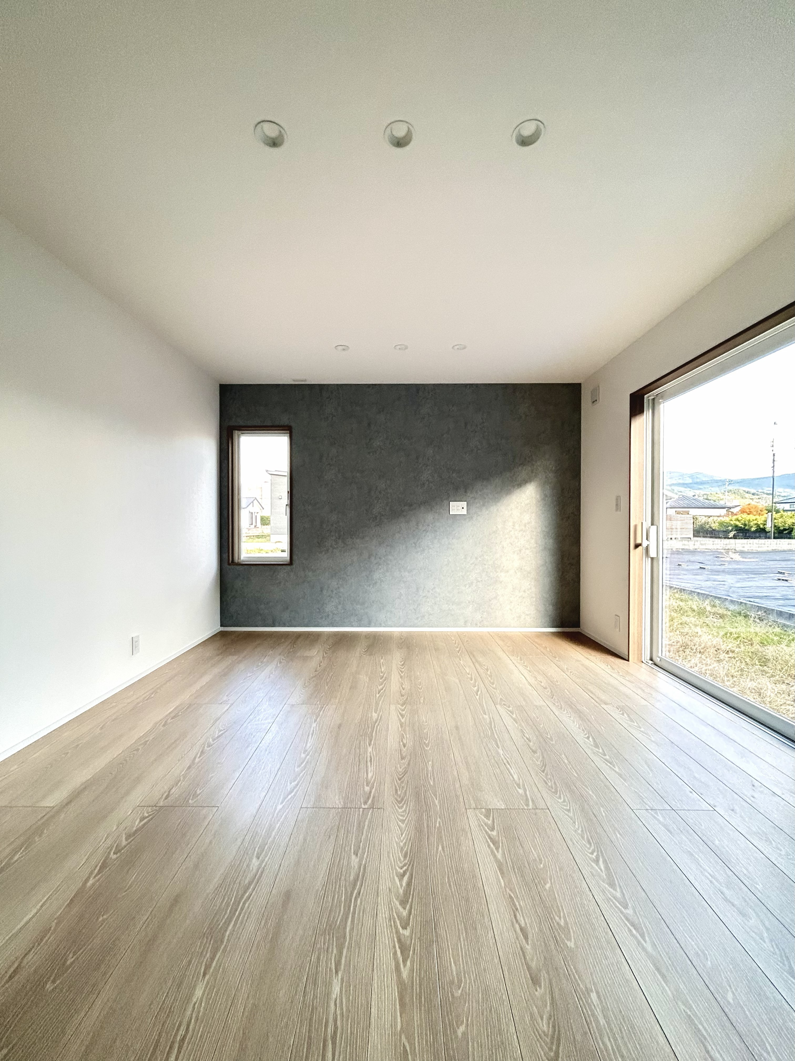 実際より広く、開放的に感じます。アクセントクロスには床色と合うグレーを採用