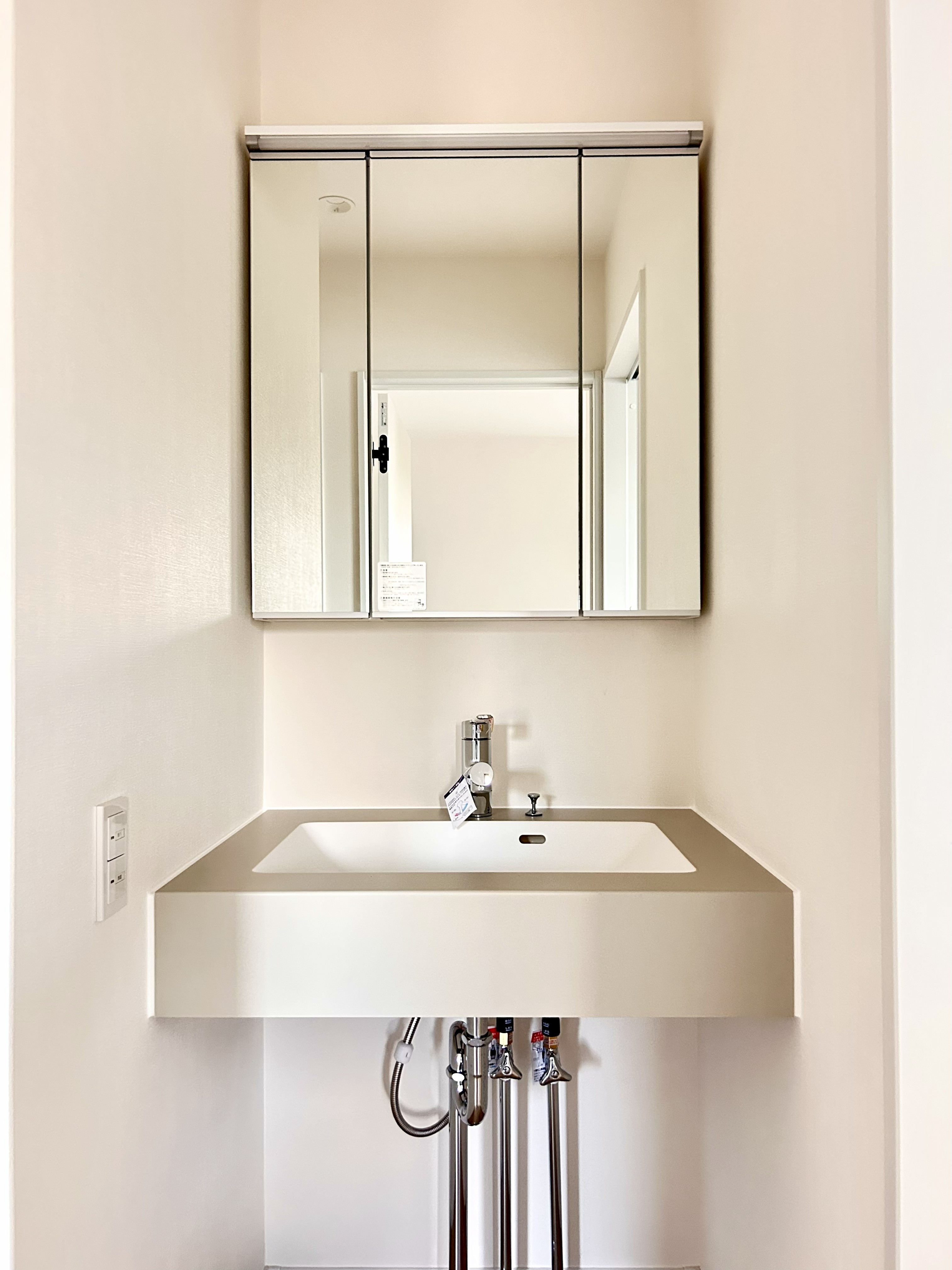 継ぎ目がなく汚れが溜まりにくく、日々のお手入れが簡単です。+で三面鏡の裏側はすべて収納になっており、洗面用品をすっきり収納。常にカウンター上を美しく保てます。