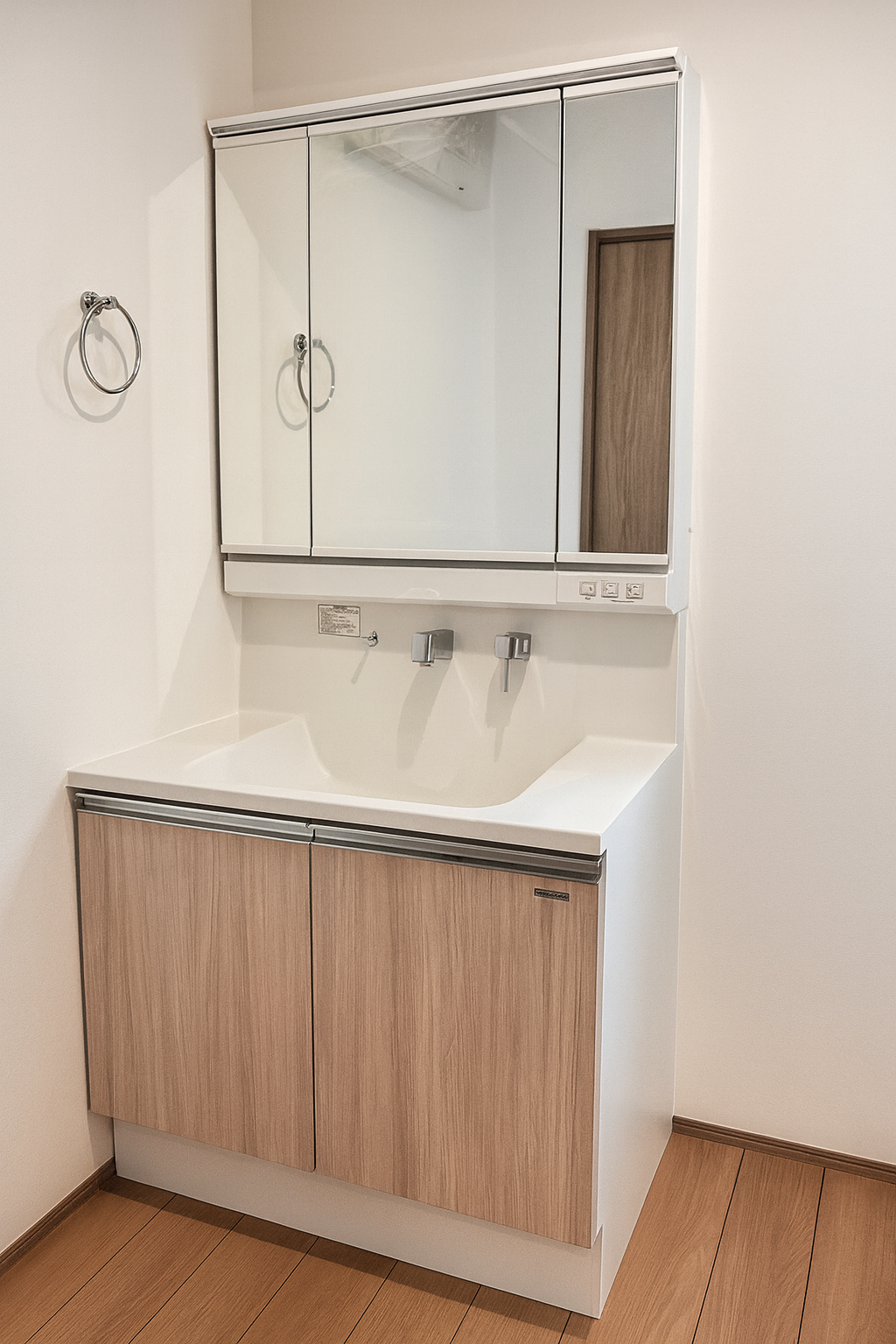 木目の質感とシャープなラインが美しい洗面台。シンプルでありながら上質なデザインが空間を引き立てます。