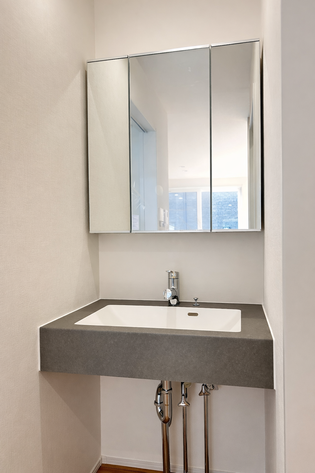 三面鏡の収納で生活感を抑え、毎日の身支度が心地よくなる洗面空間です。