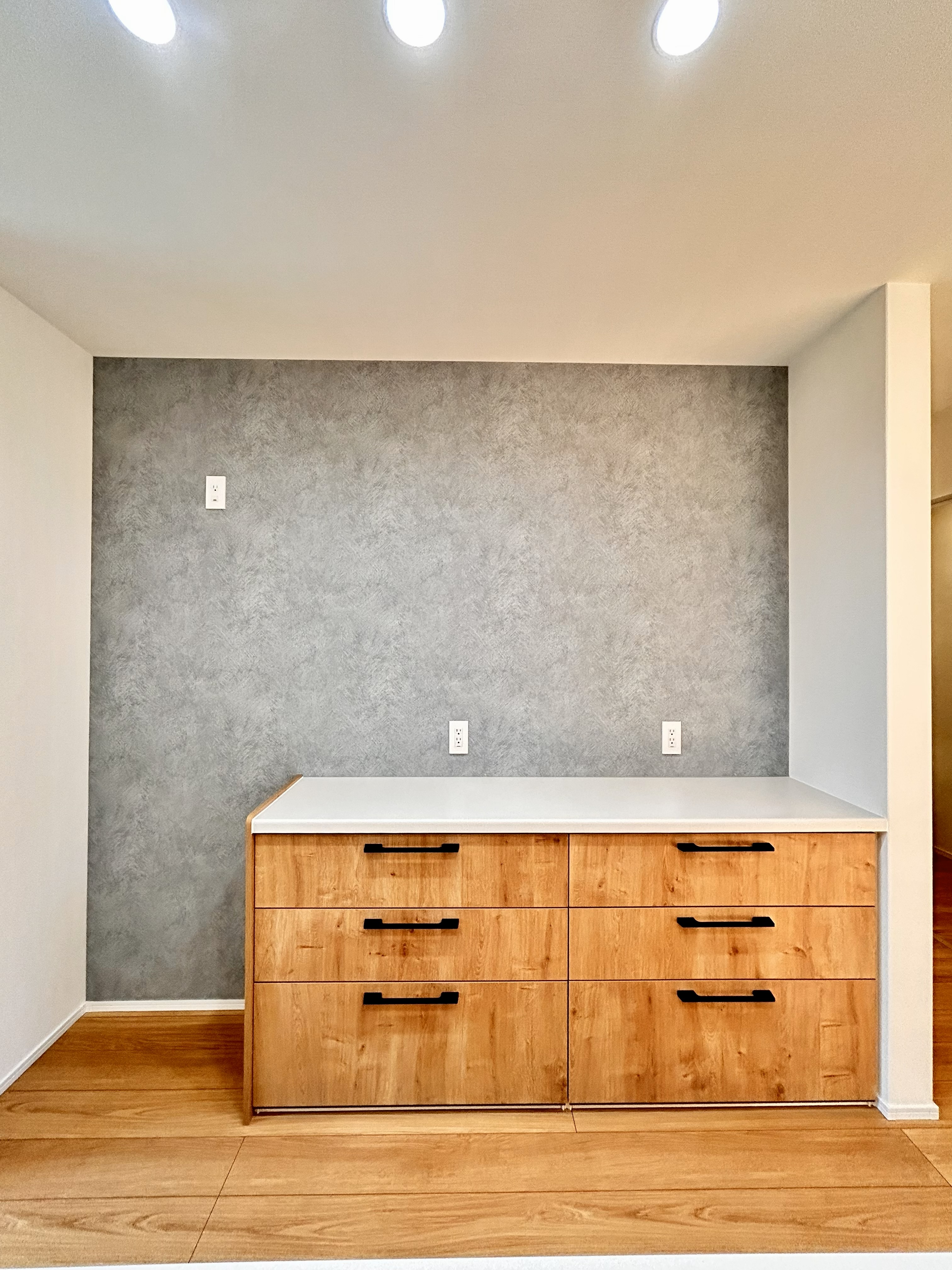 木目の造作カウンターと、グレー調クロスの組み合わせ。